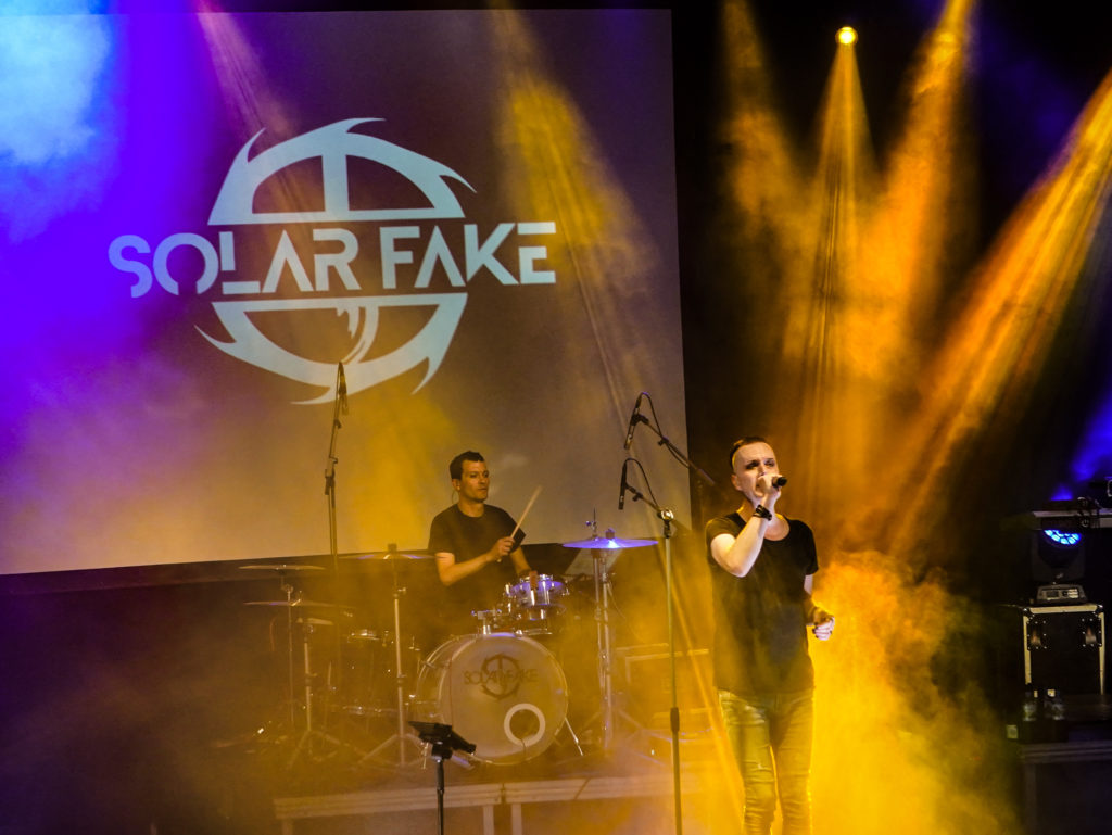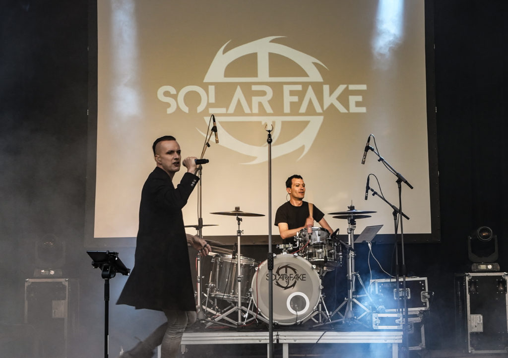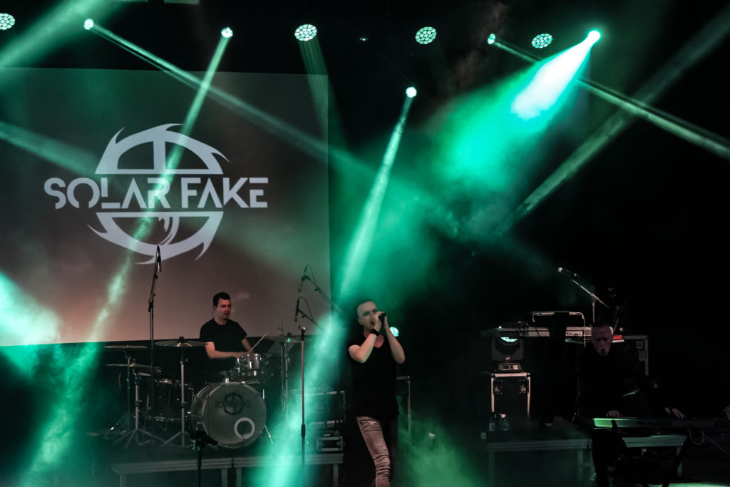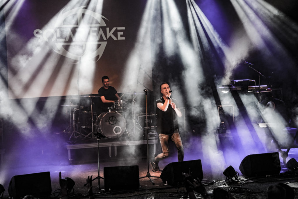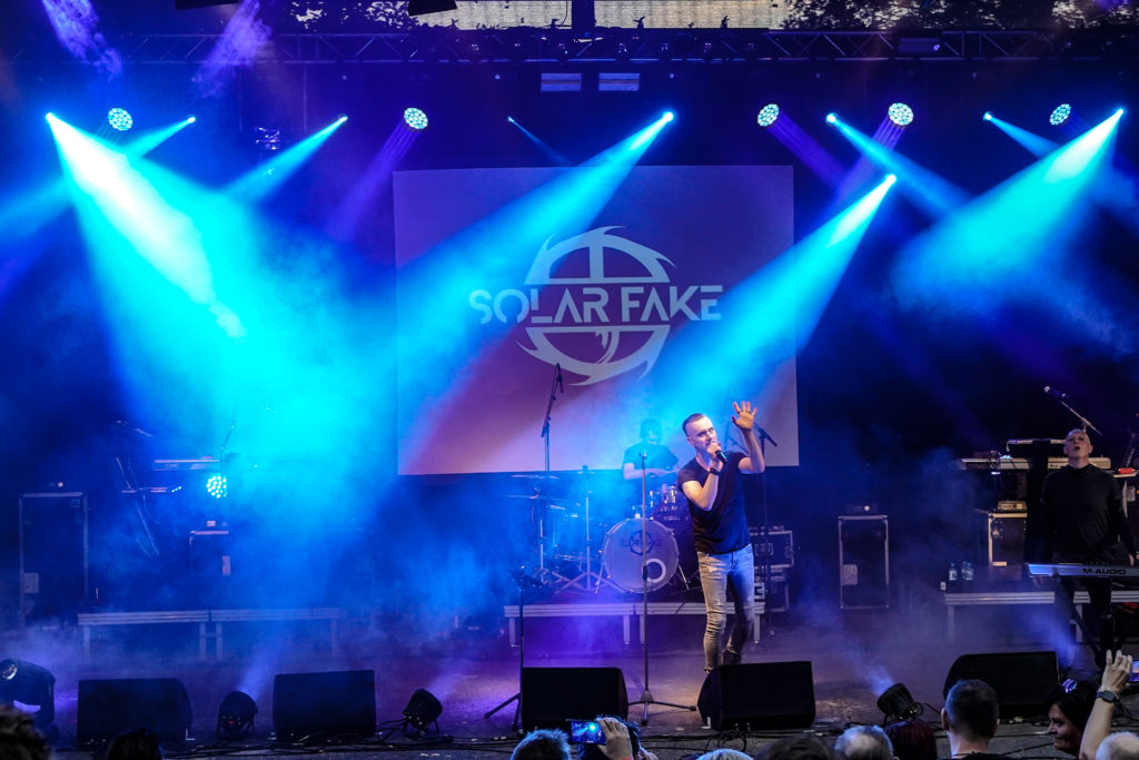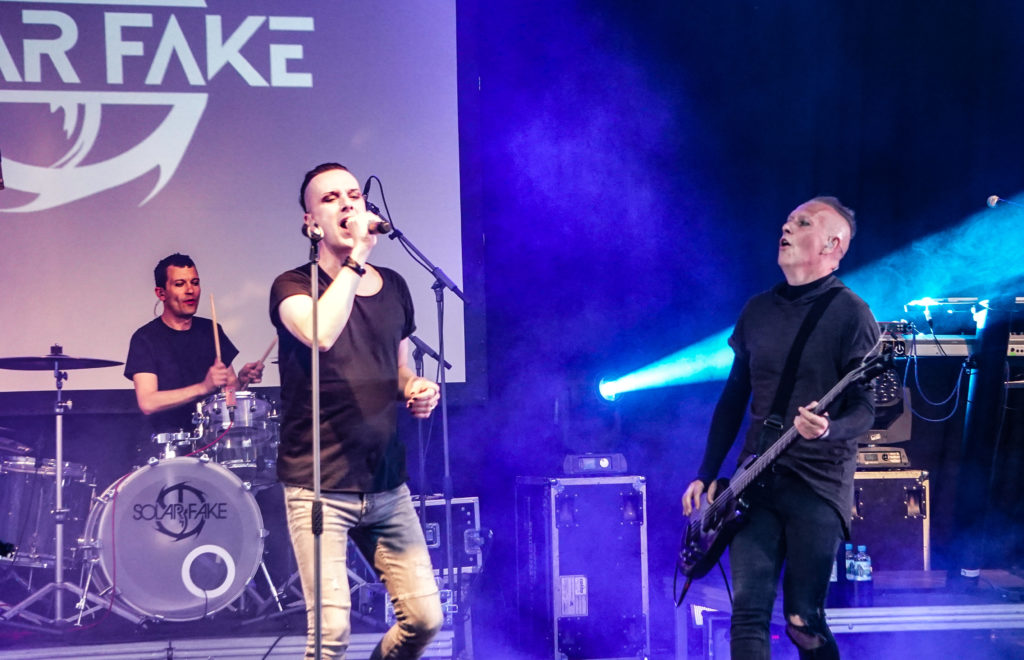 Solar Fake, der “Sonnenschein” unter den Elektrobands war dann an der Reihe, um die Fans glücklich zu machen, die von überall her angereist waren. Mehr Solar Fake – Shirts und Jacken sieht man sonst nur auf einem eigenständigen Konzert der Band. Sven Friedrich, André Feller und Jeans hatten keine Mühe die schon großartige Stimmung zu halten, sie legten sogar noch was oben drauf. Insgesamt durften wir uns über 19 Songs plus Zugabe freuen. Die Ränge mitlerweile schön gefüllt, leider nicht ganz ausverkauft, aber wenn es sich herumspricht, wie fantastisch dieser Abend war, wird es nächstes Jahr auch einen Run auf die Tickets geben.
