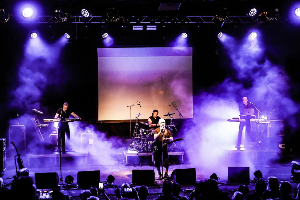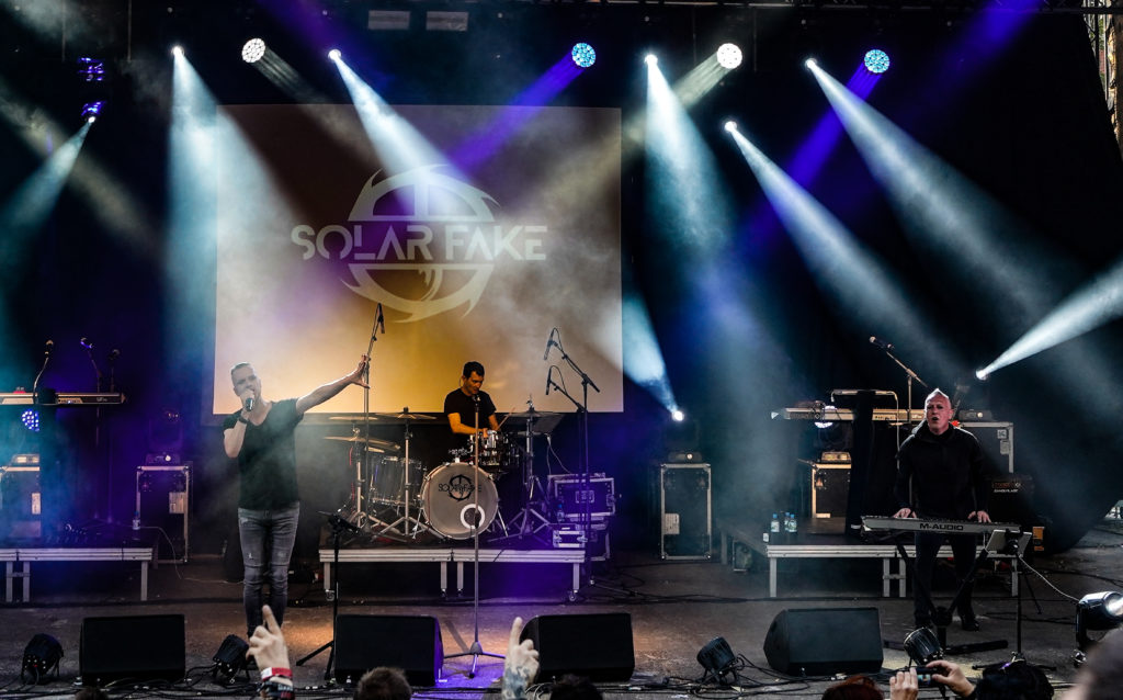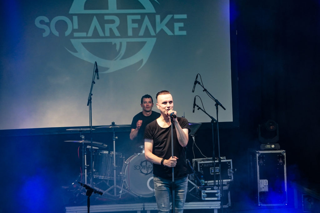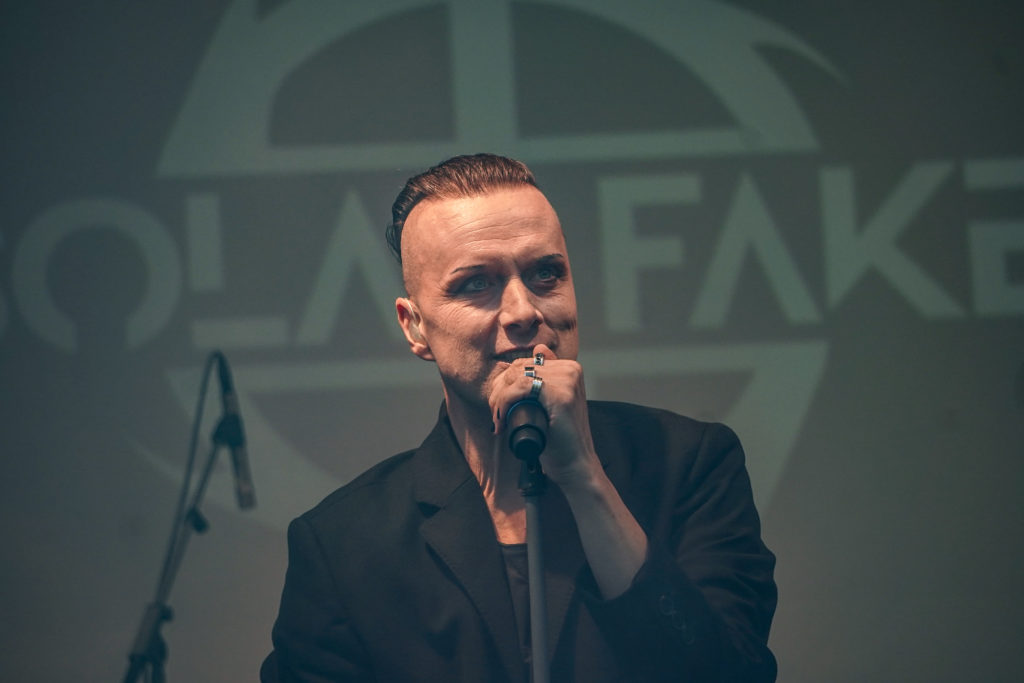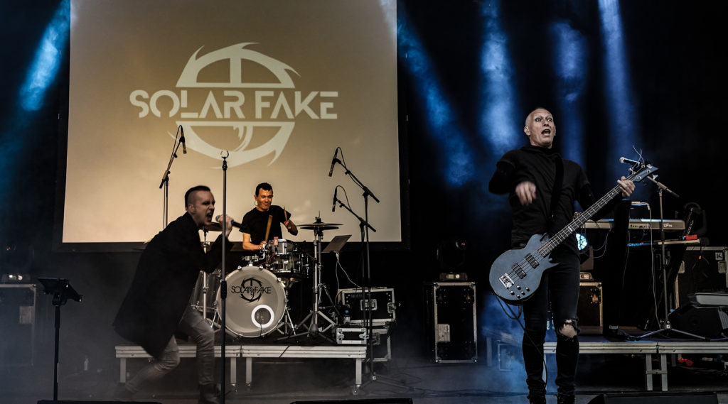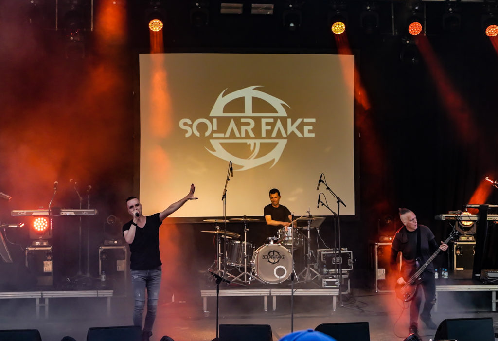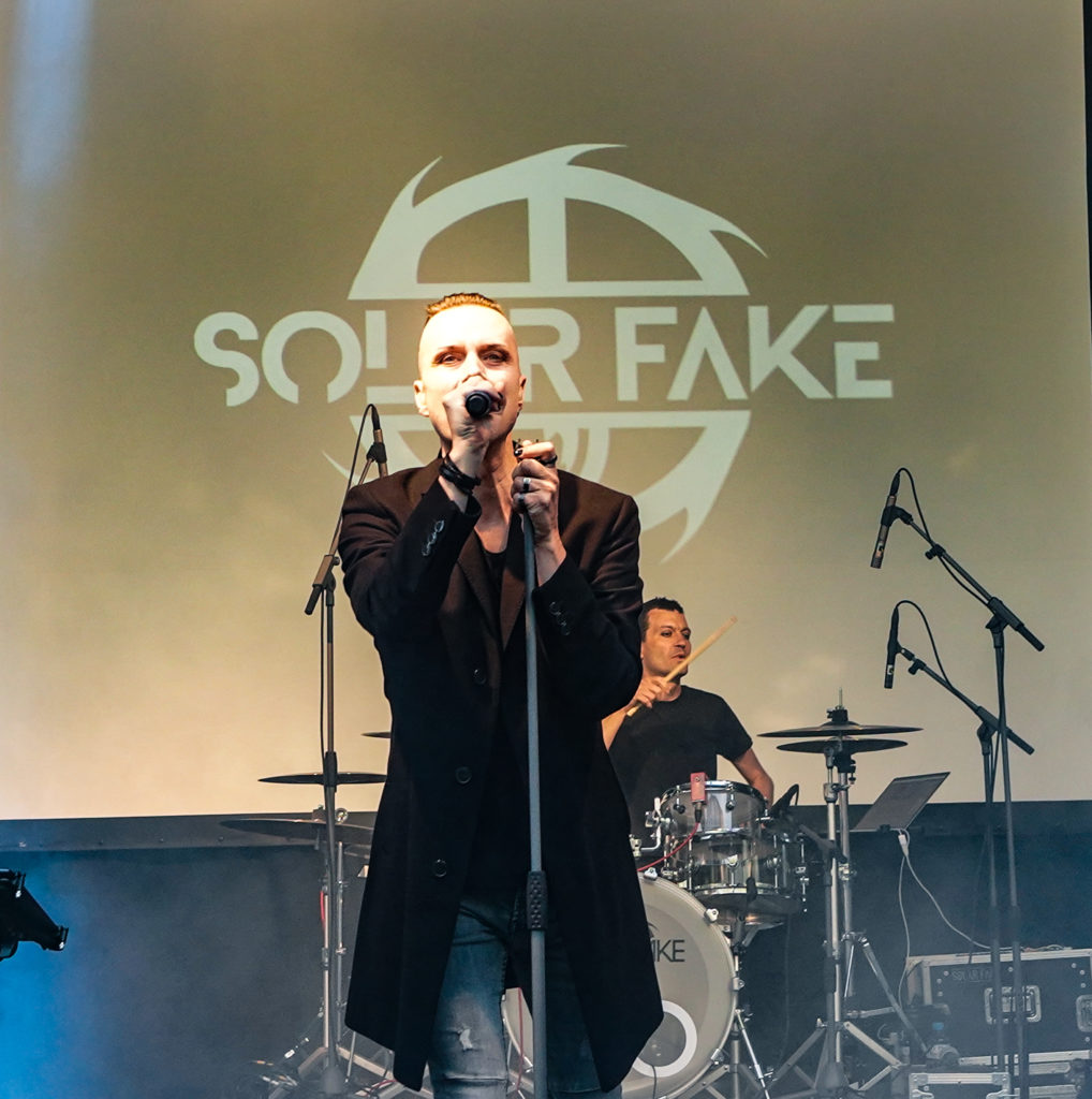 Solar Fake, der “Sonnenschein” unter den Elektrobands war dann an der Reihe, um die Fans glücklich zu machen, die von überall her angereist waren. Mehr Solar Fake – Shirts und Jacken sieht man sonst nur auf einem eigenständigen Konzert der Band. Sven Friedrich, André Feller und Jeans hatten keine Mühe die schon großartige Stimmung zu halten, sie legten sogar noch was oben drauf. Insgesamt durften wir uns über 19 Songs plus Zugabe freuen. Die Ränge mitlerweile schön gefüllt, leider nicht ganz ausverkauft, aber wenn es sich herumspricht, wie fantastisch dieser Abend war, wird es nächstes Jahr auch einen Run auf die Tickets geben.