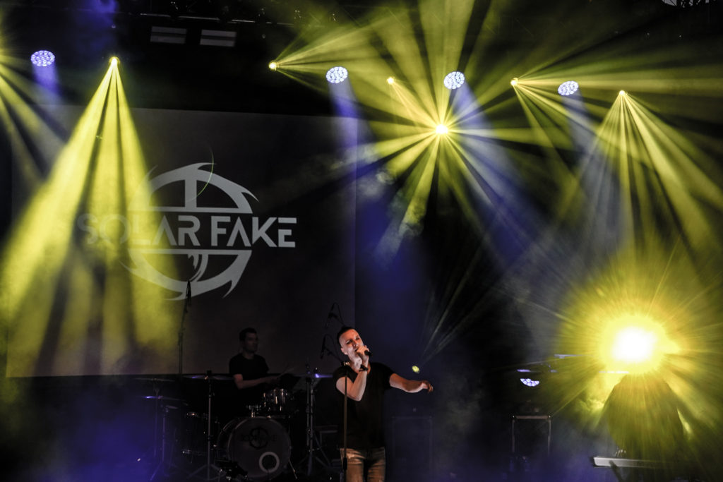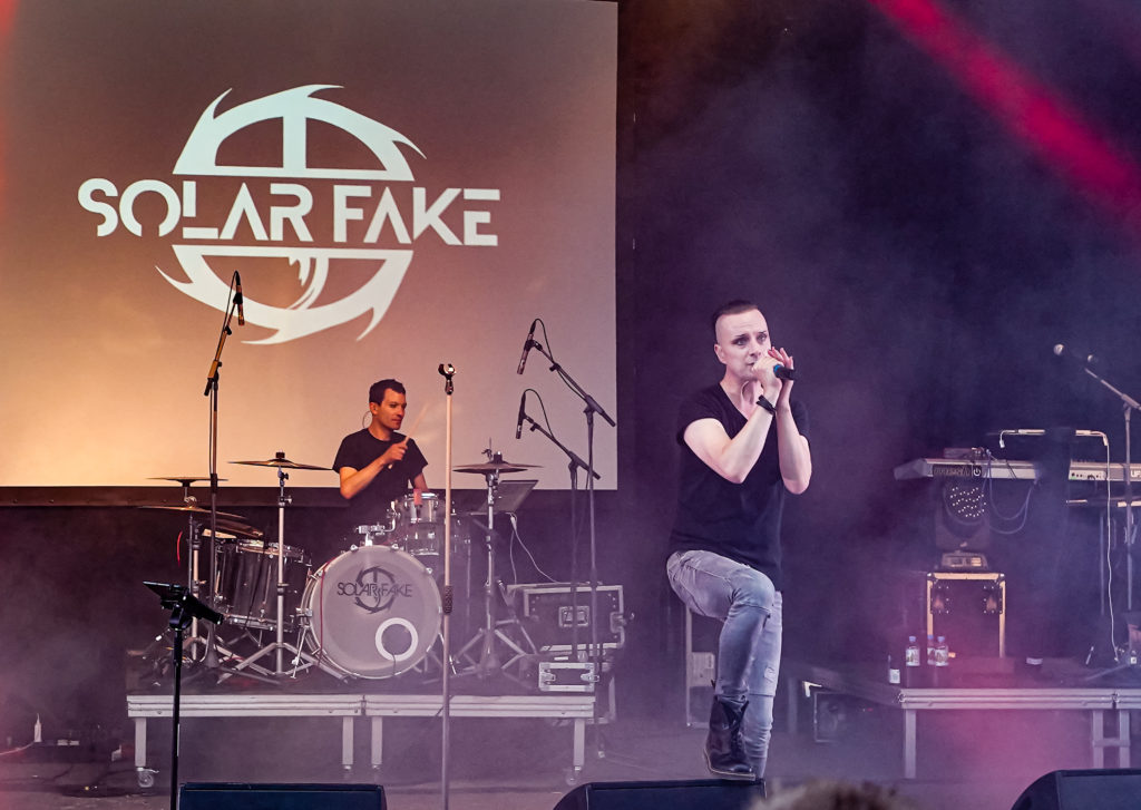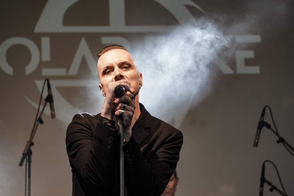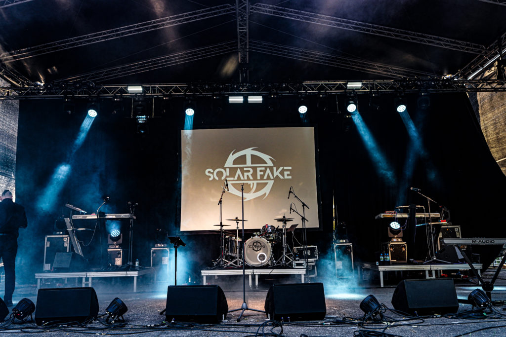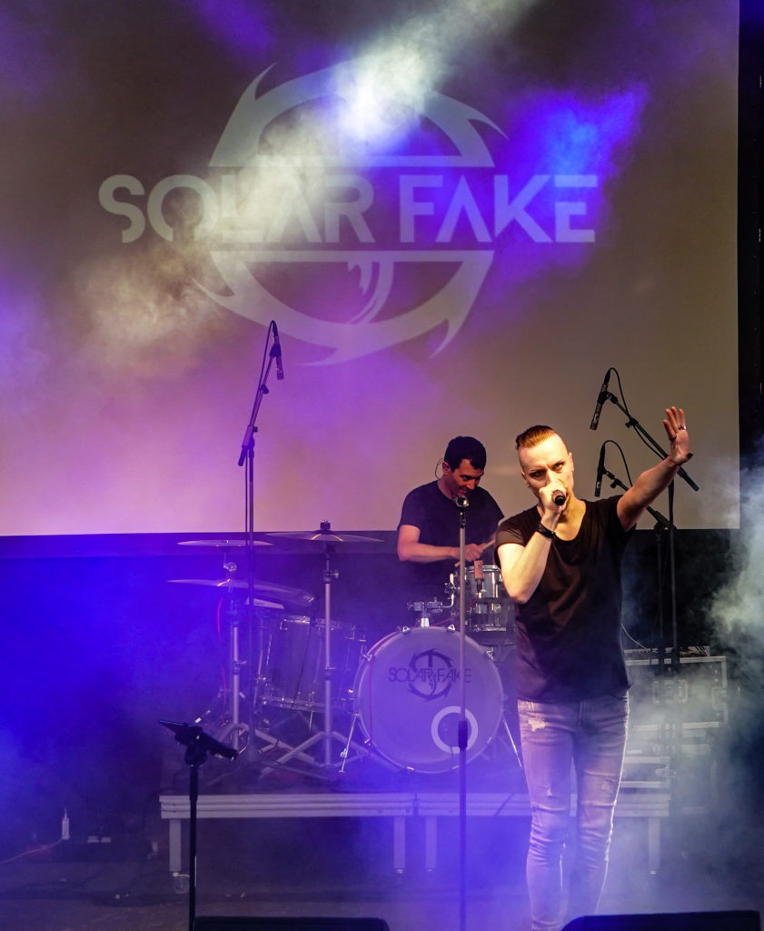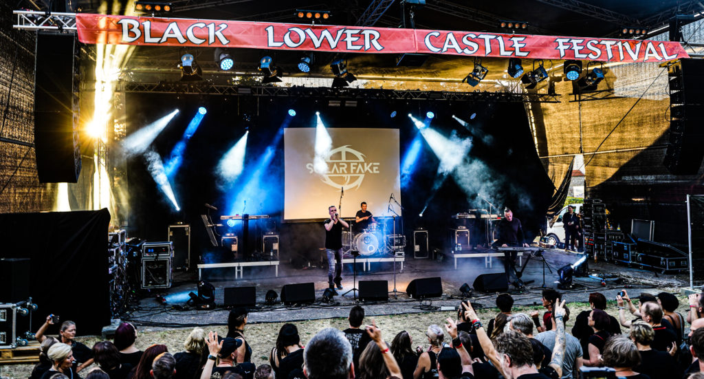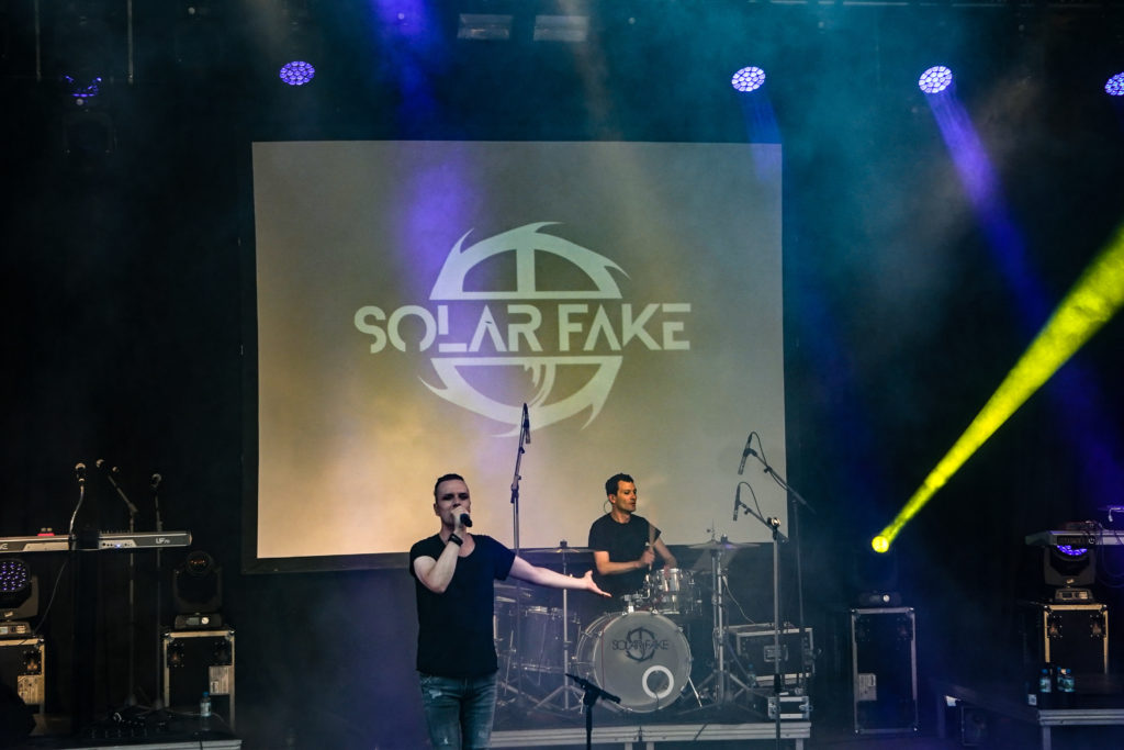 Solar Fake, der “Sonnenschein” unter den Elektrobands war dann an der Reihe, um die Fans glücklich zu machen, die von überall her angereist waren. Mehr Solar Fake – Shirts und Jacken sieht man sonst nur auf einem eigenständigen Konzert der Band. Sven Friedrich, André Feller und Jeans hatten keine Mühe die schon großartige Stimmung zu halten, sie legten sogar noch was oben drauf. Insgesamt durften wir uns über 19 Songs plus Zugabe freuen. Die Ränge mitlerweile schön gefüllt, leider nicht ganz ausverkauft, aber wenn es sich herumspricht, wie fantastisch dieser Abend war, wird es nächstes Jahr auch einen Run auf die Tickets geben.