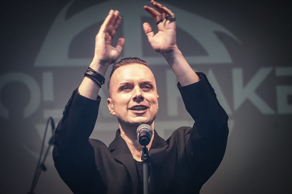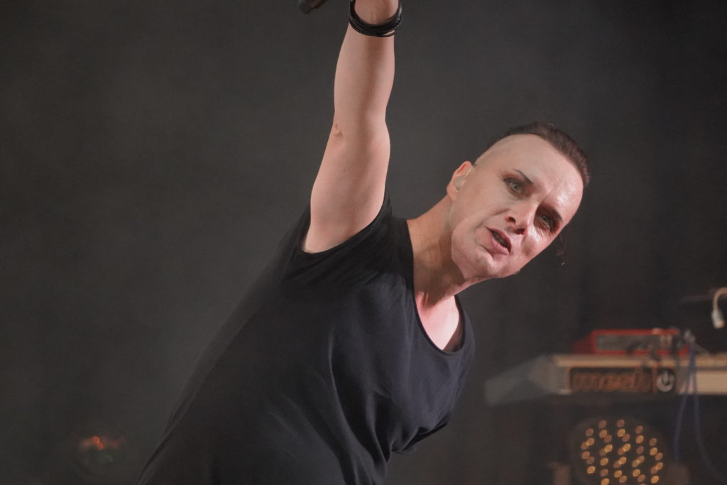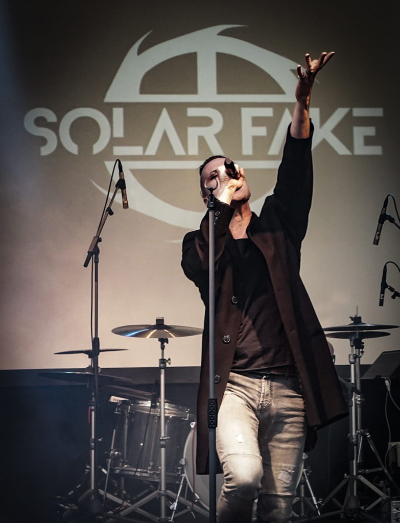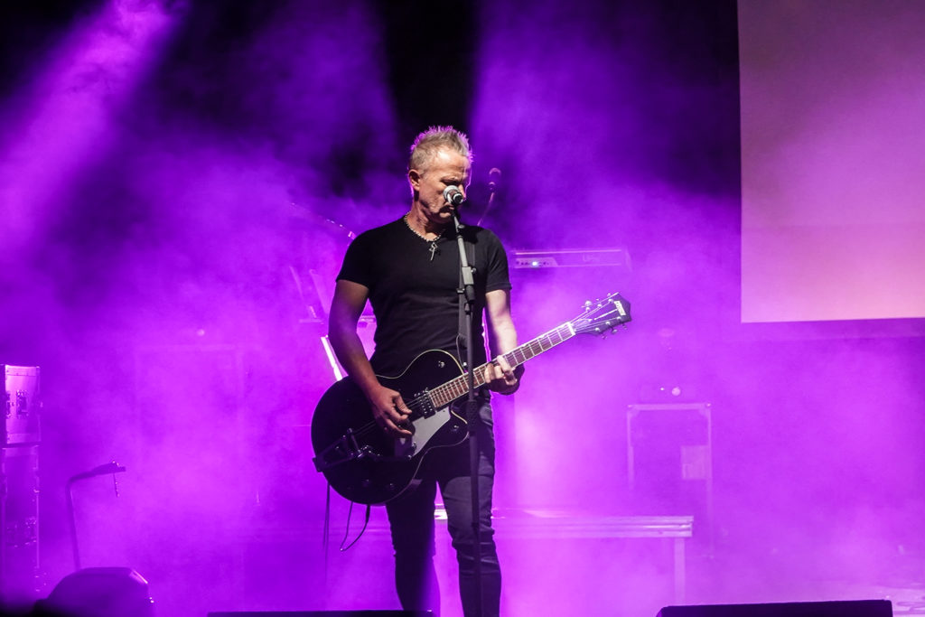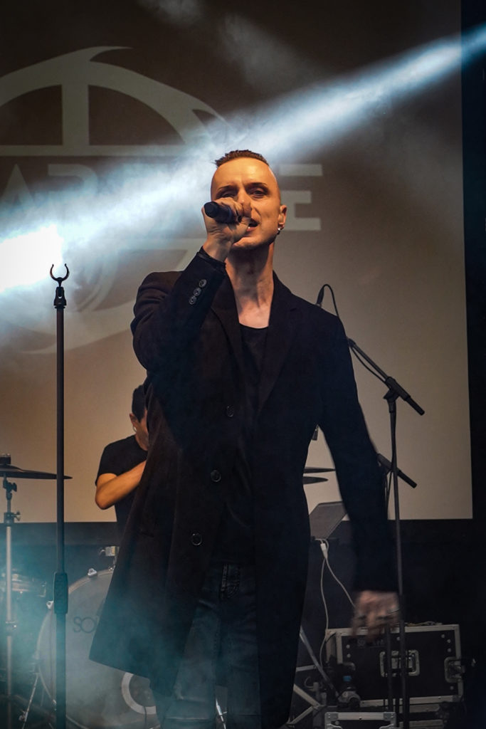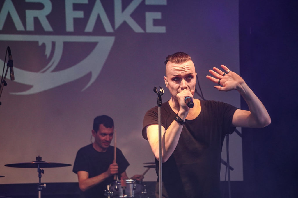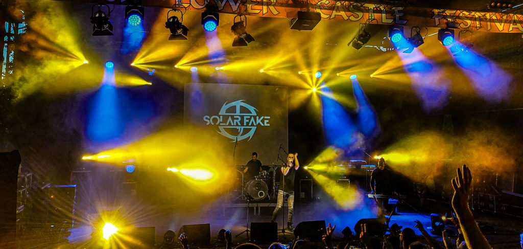 Solar Fake, der “Sonnenschein” unter den Elektrobands war dann an der Reihe, um die Fans glücklich zu machen, die von überall her angereist waren. Mehr Solar Fake – Shirts und Jacken sieht man sonst nur auf einem eigenständigen Konzert der Band. Sven Friedrich, André Feller und Jeans hatten keine Mühe die schon großartige Stimmung zu halten, sie legten sogar noch was oben drauf. Insgesamt durften wir uns über 19 Songs plus Zugabe freuen. Die Ränge mitlerweile schön gefüllt, leider nicht ganz ausverkauft, aber wenn es sich herumspricht, wie fantastisch dieser Abend war, wird es nächstes Jahr auch einen Run auf die Tickets geben.