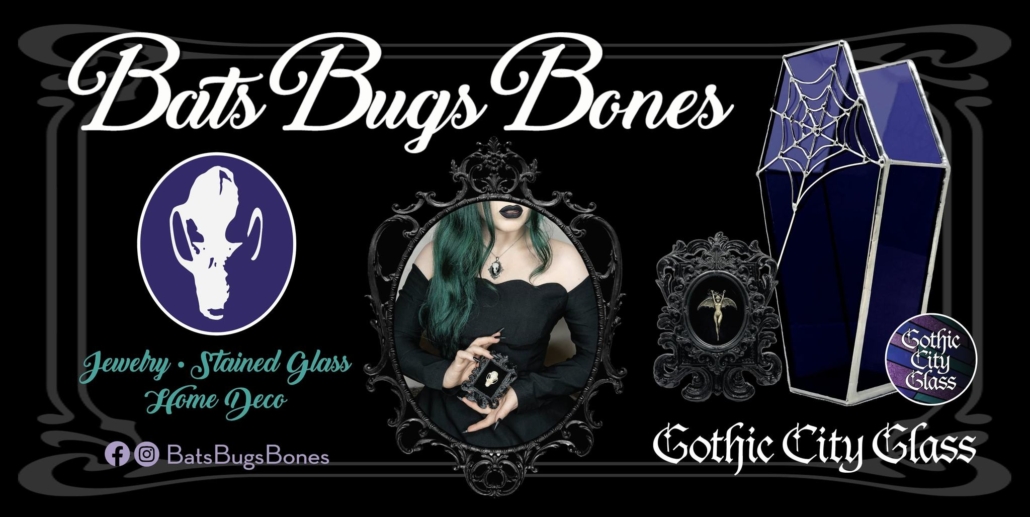 Die Website von Bats Bugs Bines umfasst auch Artikel von Gothic City Glass, meine gotischen Tiffany-Glasartikel, und Spooky Woodart, die handgefertigten gotischen Weihnachtsdekorationen aus Holz meines Mannes.