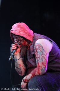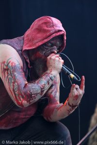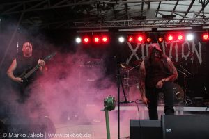 Nach jeder Band gab es eine Pause von einer halben Stunde. Der Zeitplan wurde exakt eingehalten. Somit betrat die 2011 gegründete Band Xicution pünktlich um 18:30 Uhr die Bühne. Die Death Metal Band aus Eberswalde überzeugte mit einer tollen Liveshow. Der Sänger trug eine coole Maske und alle Musiker waren mit Kunstblut überströmt.