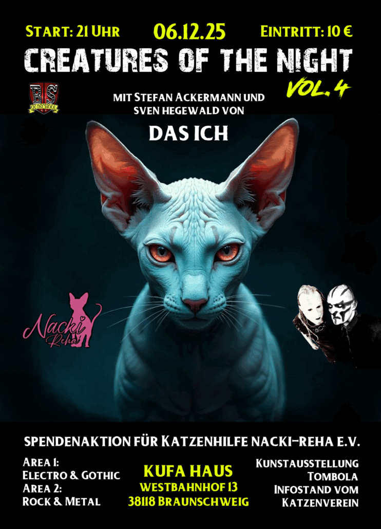 Ab 21 Uhr öffnen sich die Tore zu einem Abend, der alles vereint, was die Szene liebt: treibende Beats, starke Emotionen und eine gute Portion Herz. Denn wie schon in den Vorjahren steht auch diese Ausgabe unter einem karitativen Stern. Der gesamte Erlös der Tombola geht an die Katzenhilfe Nacki Reha e.V. aus Salzgitter – ein Verein, der sich mit unermüdlicher Hingabe um haarlose Katzen kümmert. Wer möchte, kann zudem an den bereitstehenden Spendendosen direkt unterstützen.